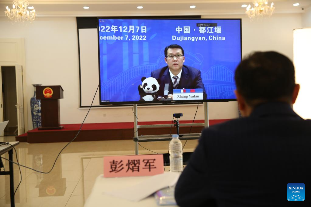 Photo taken in St. Julian's, Malta, on Dec. 7, 2022 shows Zhang Yadan (on the screen), mayor of China's Dujiangyan, speaking at an online signing ceremony of a sister city agreement. Marsaskala, a seaside town in the southeast of Malta, and Dujiangyan, a city in China's southwestern Sichuan Province, signed a sister city agreement on Wednesday. (Xinhua/Chen Wenxian)