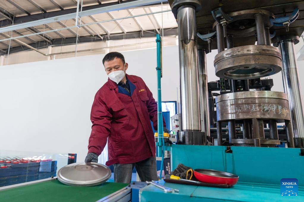 A worker works on a production line of multifunctional cookware in a factory in Lhasa, southwest China's Tibet Autonomous Region, Nov. 27, 2022. (Xinhua/Zhou Dixiao)