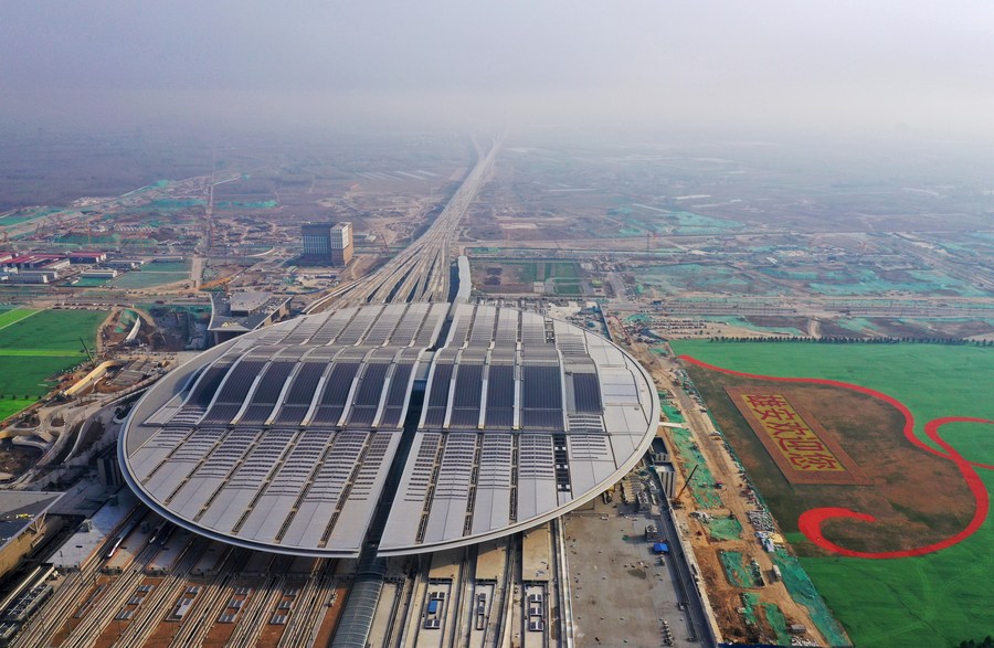 Aerial photo taken on April 1, 2021 shows the Xiongan Railway Station of the Beijing-Xiongan intercity railway in Xiongan New Area, north China's Hebei Province. (Xinhua/Xing Guangli)