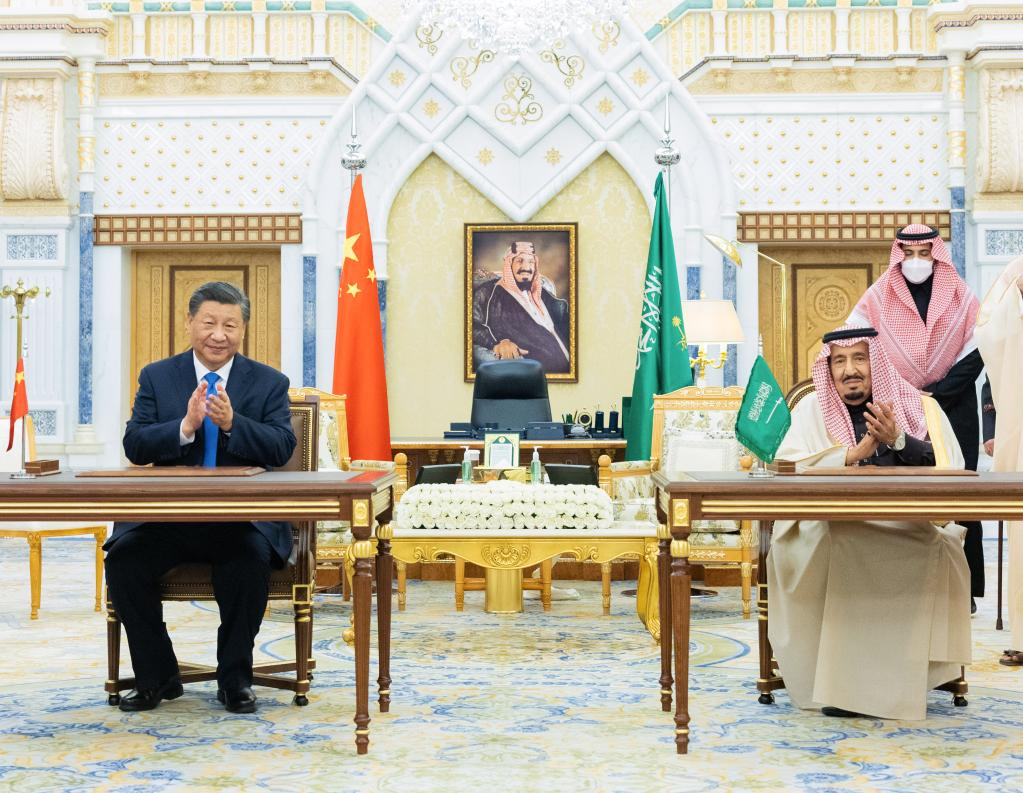 Chinese President Xi Jinping and King Salman bin Abdulaziz Al Saud of Saudi Arabia co-sign in person the comprehensive strategic partnership agreement between the People's Republic of China and the Kingdom of Saudi Arabia, and agree to take turns to host biennial meetings between the heads of state of the two countries, at Riyadh's al-Yamamah Palace in Saudi Arabia, Dec. 8, 2022. (Xinhua)