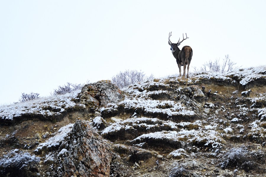Photo taken on Oct. 19, 2021 shows a white-lipped deer at the source of the Yellow River section of the Sanjiangyuan National Park in Golog Tibetan Autonomous Prefecture of northwest China's Qinghai Province. (Xinhua/Zhang Long)