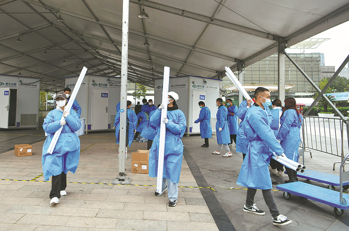 Workers dismantle an area for nucleic acid testing at Shanghai Railway Station on Thursday. CHEN MENGZE/FOR CHINA DAILY