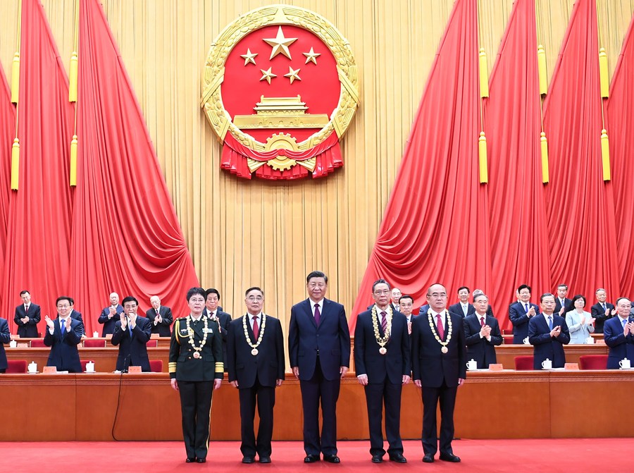 Xi Jinping presents medals to the recipient of the Medal of the Republic Zhong Nanshan (2nd R, front), and recipients of the national honorary title, "the People's Hero," Zhang Boli (2nd L, front), Zhang Dingyu (1st R, front) and Chen Wei (1st L, front), at a meeting commending role models in the country's fight against the COVID-19 epidemic at the Great Hall of the People in Beijing, capital of China, Sept. 8, 2020. (Xinhua/Xie Huanchi)