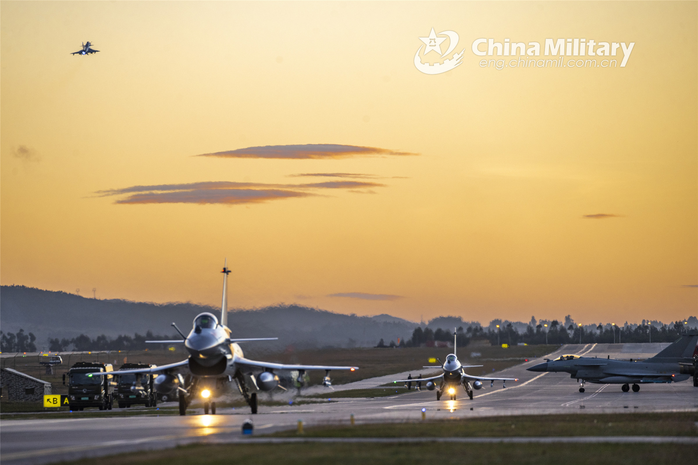 Fighter jets attached to an aviation brigade of the air force under the PLA Southern Theater Command taxi on the runway to get ready for a round-the-clock flight training exercise on November 18, 2022. (eng.chinamil.com.cn/Photo by Wang Guoyun)