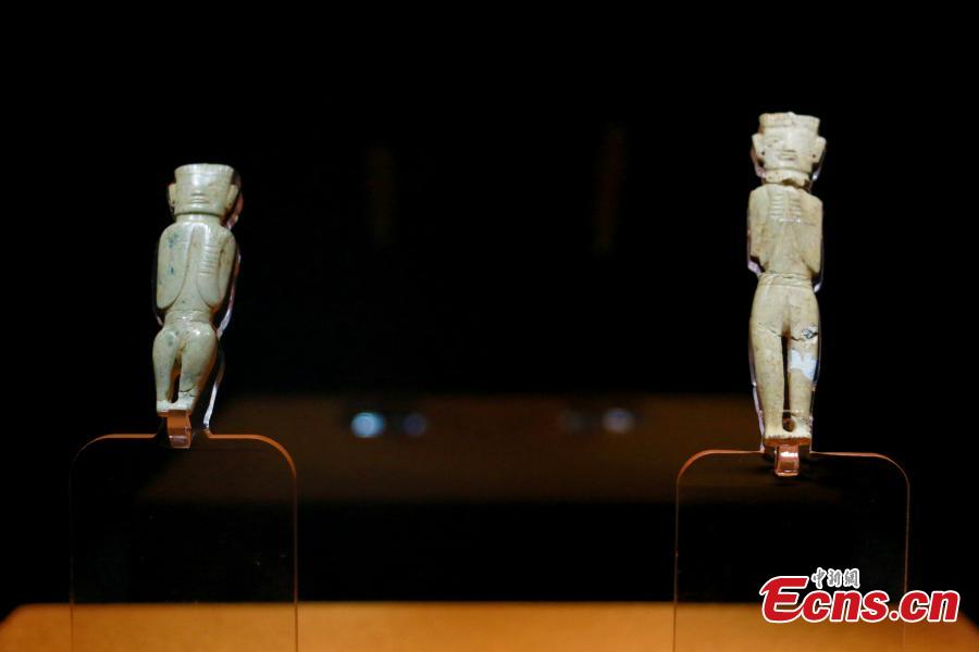 A pair of jade human sculptures are on display during an exhibition on Lingjiatan culture in Hefei, east China's Anhui Province, Dec. 7, 2022. (Photo: China News Service/Zhang Qiang)