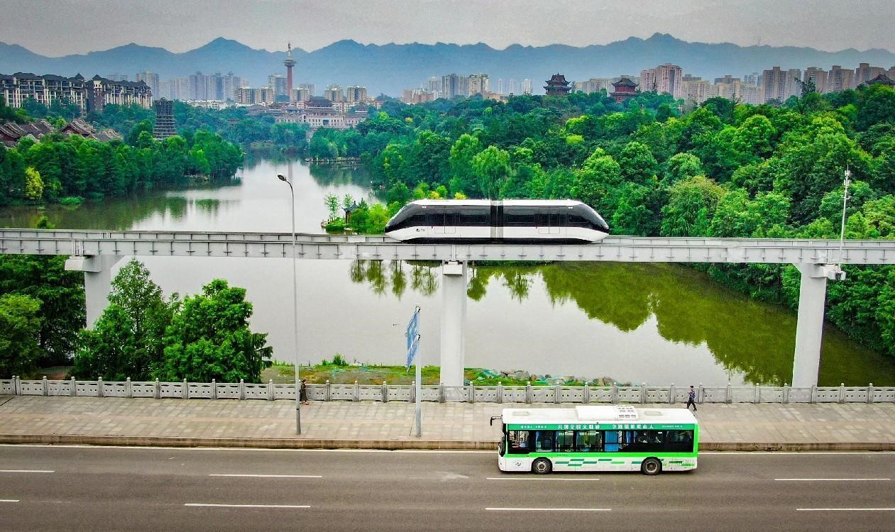A car of an elevated rubber-tyred metro line and a new energy vehicle run in Bishan district, southwest China's Chongqing municipality. (People's Daily Online/Hu Yuejian)
