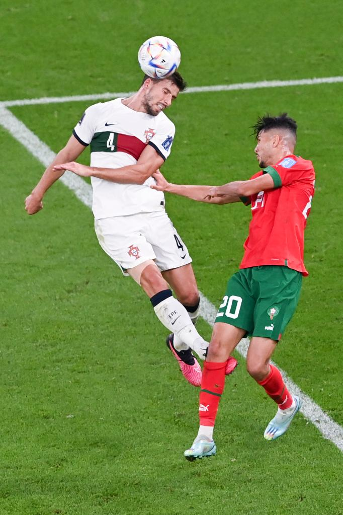 Ruben Dias (L) of Portugal vies with Achraf Dari of Morocco during their Quarterfinal of the 2022 FIFA World Cup at Al Thumama Stadium in Doha, Qatar, Dec. 10, 2022. (Xinhua/Li Jundong)