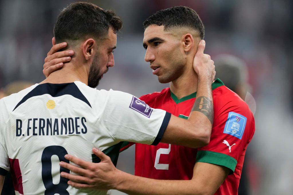 Bruno Fernandes (L) of Portugal greets Achraf Hakimi of Morocco after their Quarterfinal of the 2022 FIFA World Cup at Al Thumama Stadium in Doha, Qatar, Dec. 10, 2022. (Xinhua/Xiao Yijiu)
