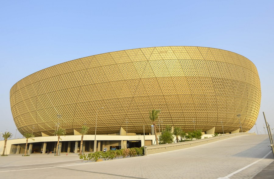 This photo taken on Aug. 11, 2022 shows the exterior view of Lusail Stadium, the main venue for the 2022 FIFA World Cup in Doha, Qatar. (Photo by Nikku/Xinhua)