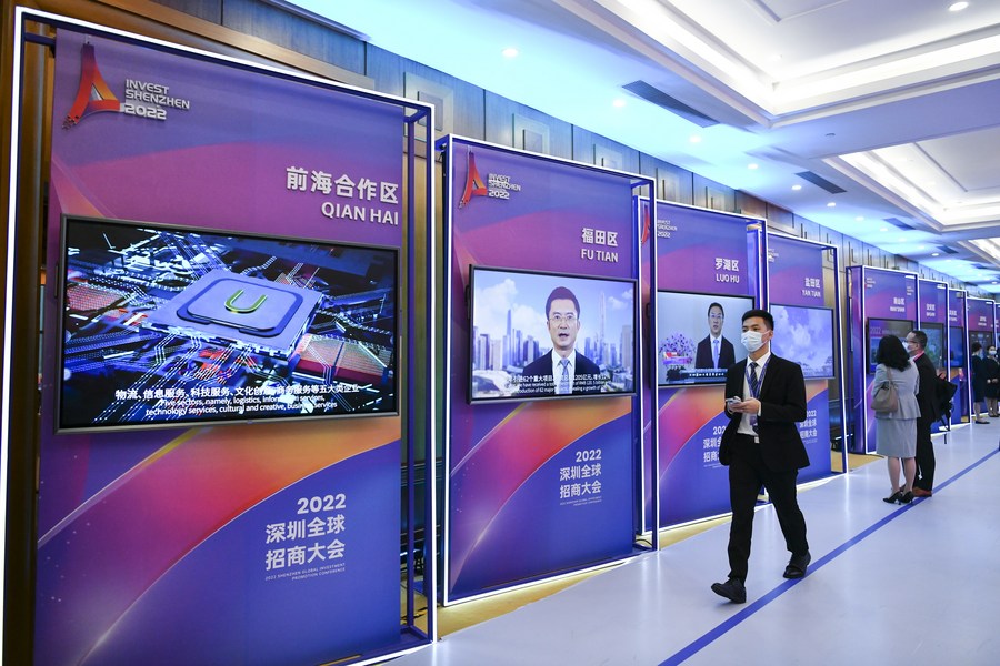 Videos of Shenzhen's various districts are displayed at the 2022 Shenzhen Global Investment Promotion Conference in Shenzhen, south China's Guangdong Province, Dec. 9, 2022. (Xinhua/Liang Xu)