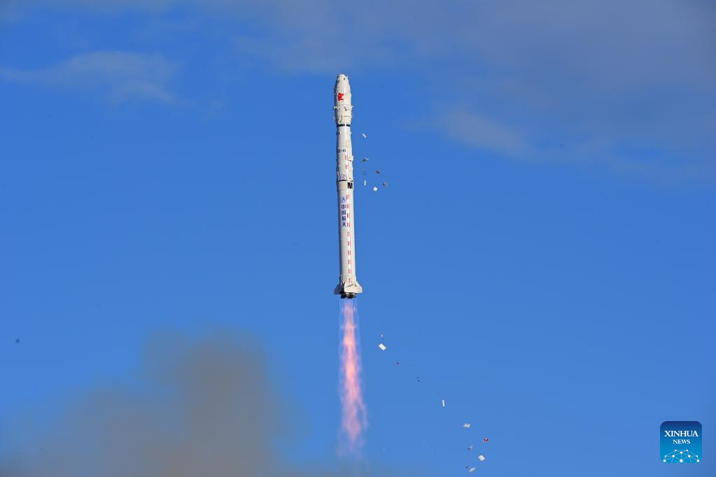 A Long March-4C rocket carrying satellites Shiyan-20A and Shiyan-20B is launched from the Jiuquan Satellite Launch Center in northwest China, Dec. 12, 2022. The rocket blasted off at 4:22 p.m. (Beijing Time) on Monday and sent the satellites into the preset orbit. (Photo by Wang Jiangbo/Xinhua)