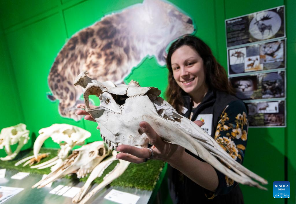 A staff member shows a skull of moose at Quebec's Biodiversity Museum in Becancour, Canada, Dec. 11, 2022. Founded in 1997, Quebec's Biodiversity Museum is situated in Becancour, 150 km from Montreal, Canada.