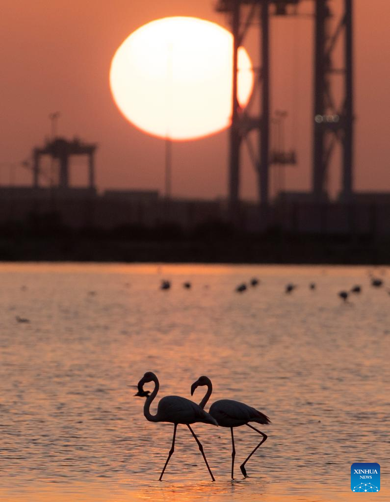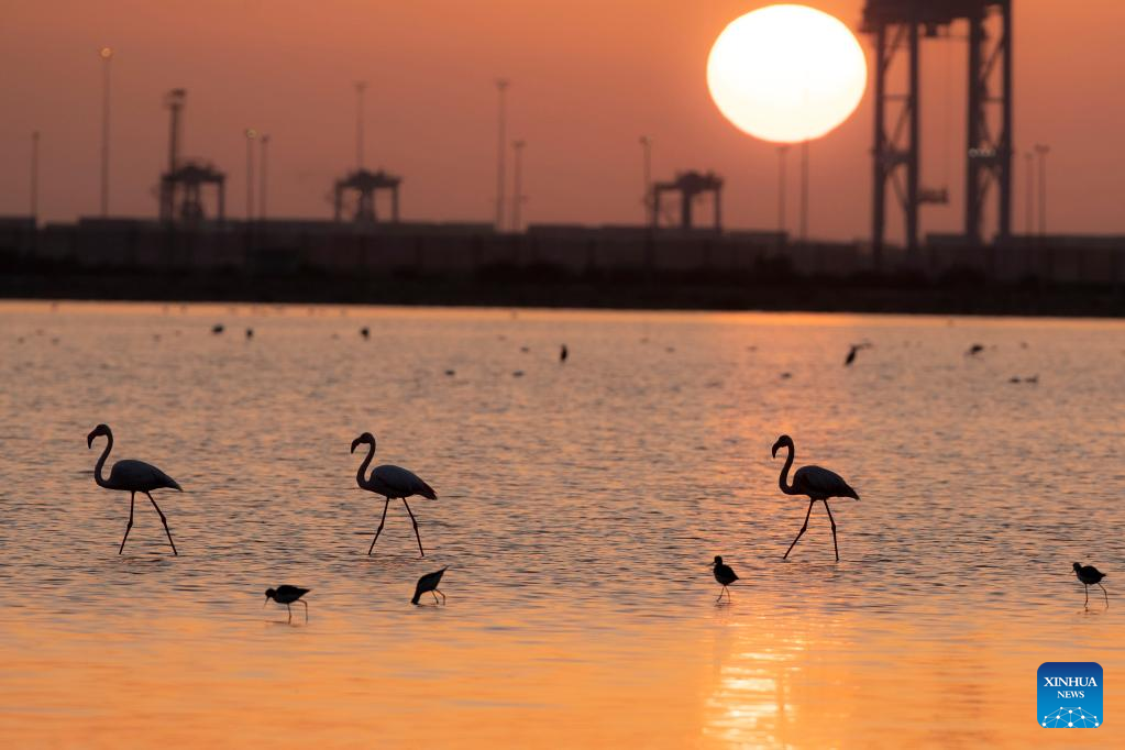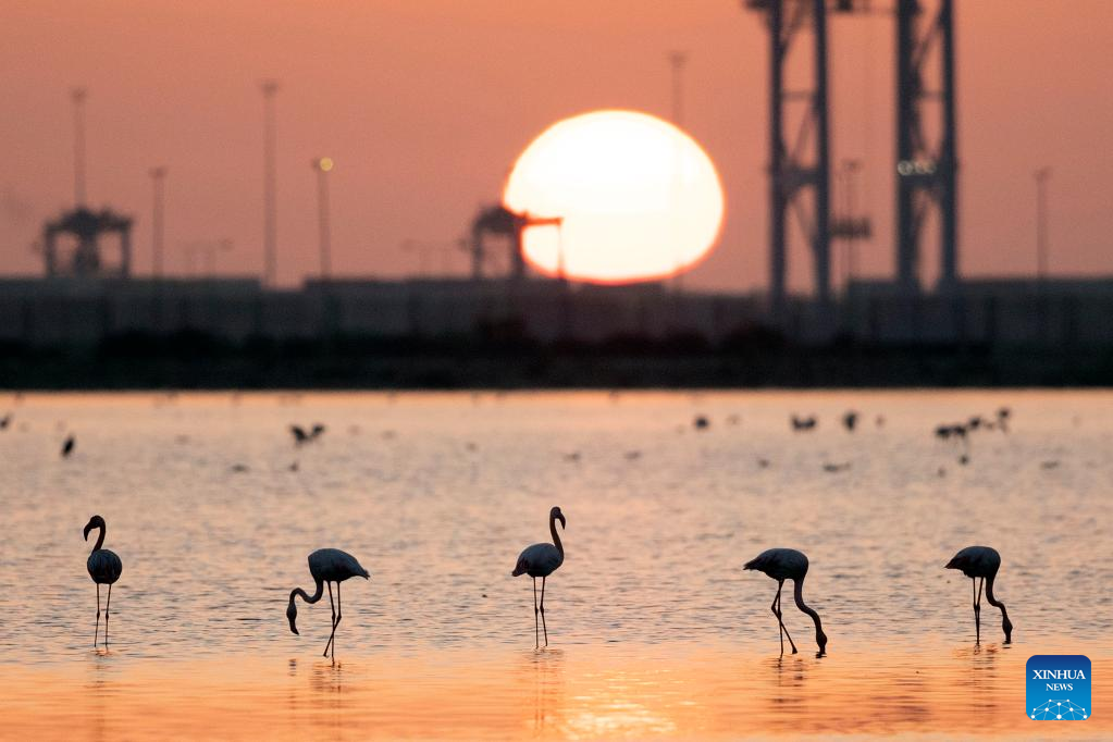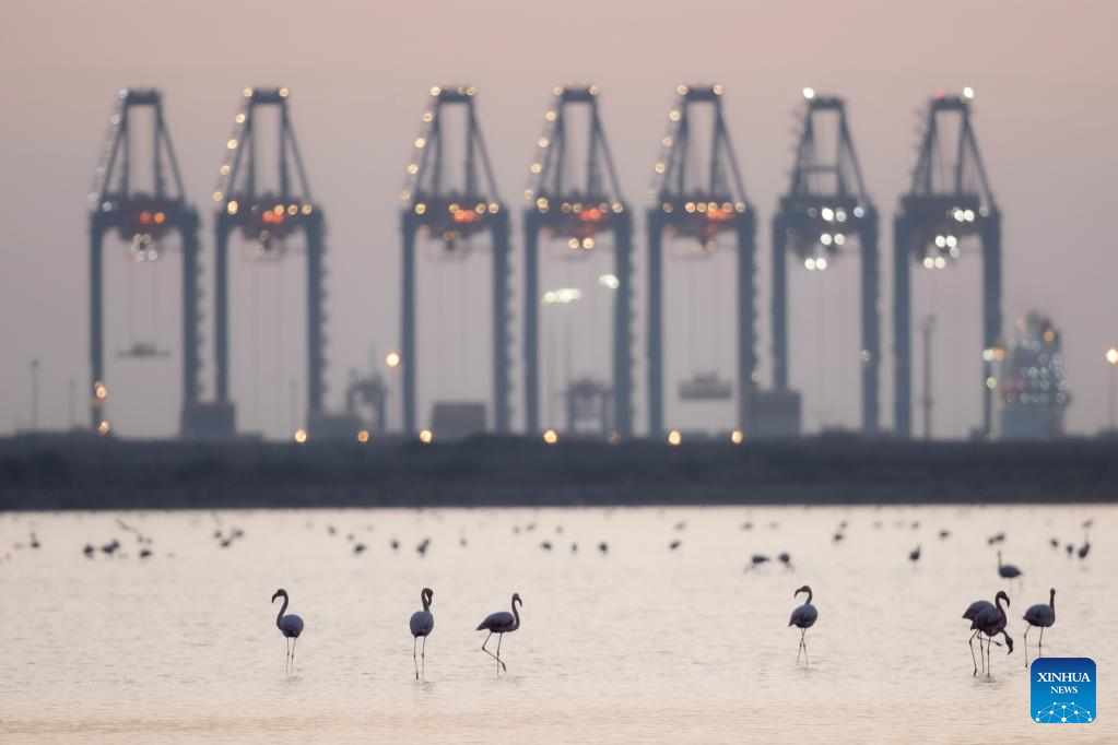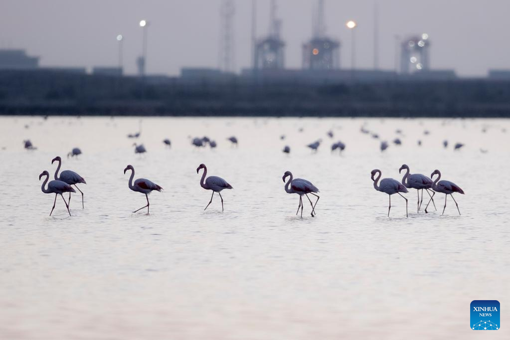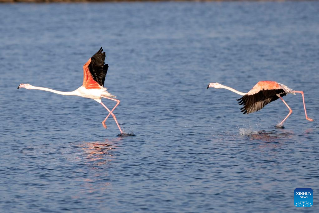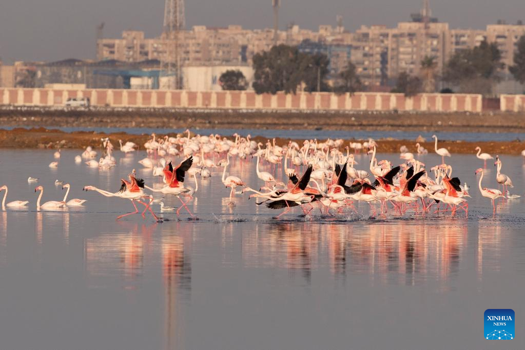 Flamingoes are pictured at a nature reserve in Port Fouad, Port Said Governorate, Egypt, Dec. 12, 2022. Every year, large numbers of flamingoes come here to spend the warm winter. (Xinhua/Ahmed Gomaa)