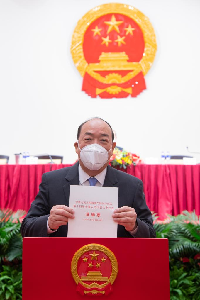 Ho Iat Seng, chief executive of the Macao Special Administrative Region (SAR) and standing chairman of the presidium, casts his vote at the second plenary session of the Conference for Electing Deputies of the Macao SAR to the 14th National People's Congress (NPC), in south China's Macao, Dec. 12, 2022. (Xinhua/Cheong Kam Ka)