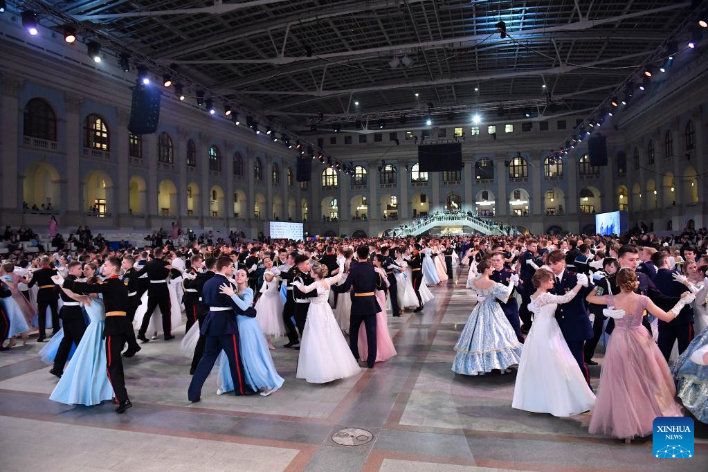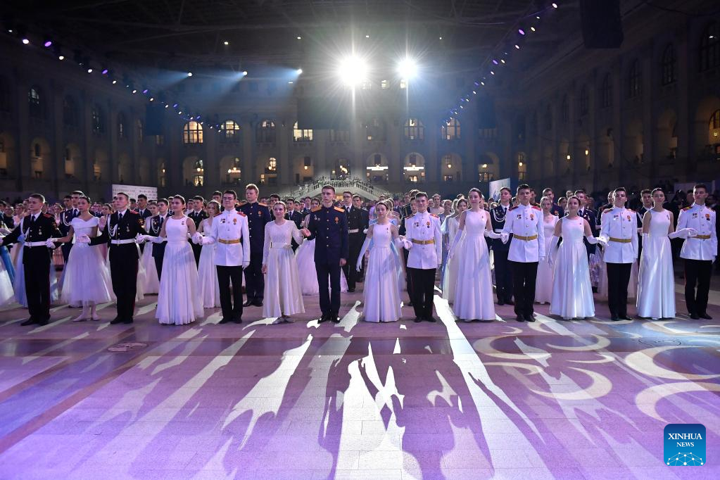 Participants dance during the International Charity Cadet Ball in Moscow, Russia, on Dec. 13, 2022. (Photo by Alexander Zemlianichenko Jr/Xinhua)