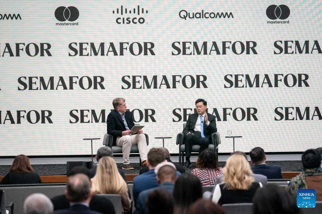 The Chinese ambassador to the United States Qin Gang (R) speaks during a fireside chat, part of a series of discussions hosted by Semafor, in Washington, D.C., the United States, Dec. 12, 2022.(Xinhua/Liu Jie)