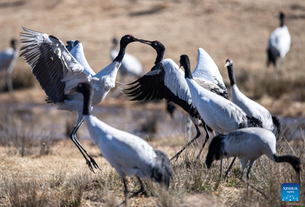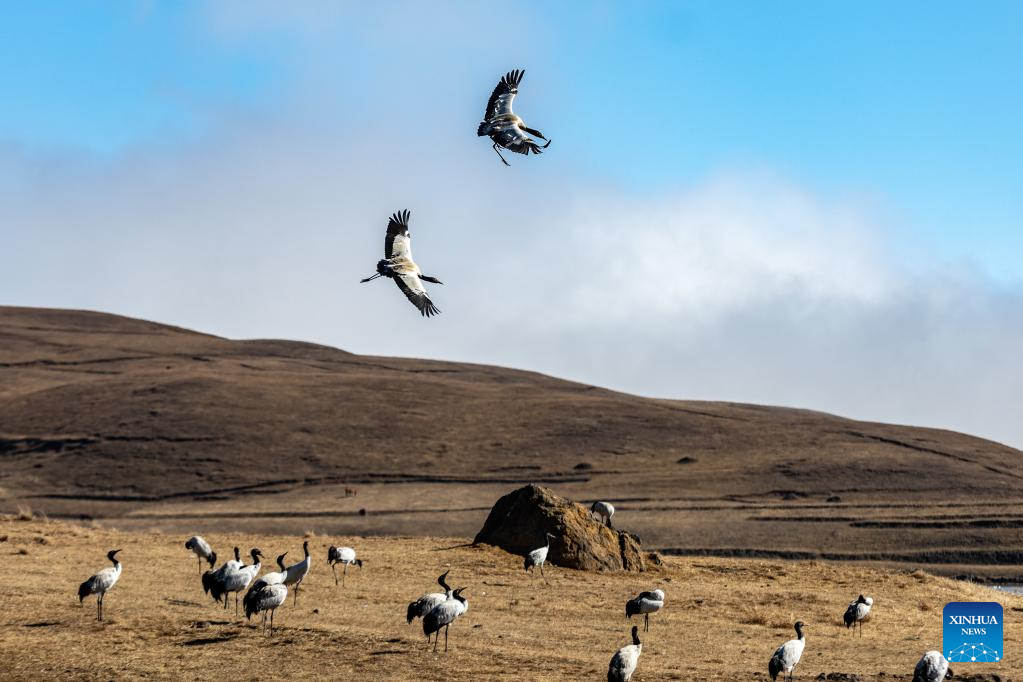 Over recent years, the reserve has made a determined effort to implement conservation measures, such as wetland protection and restoration and construction of food source bases, in order to steadily improve its ecological environment for migratory birds. During the past three years, an average of over 1,500 black-necked cranes were spotted arriving at the reserve for wintering. (Xinhua/Cao Mengyao)