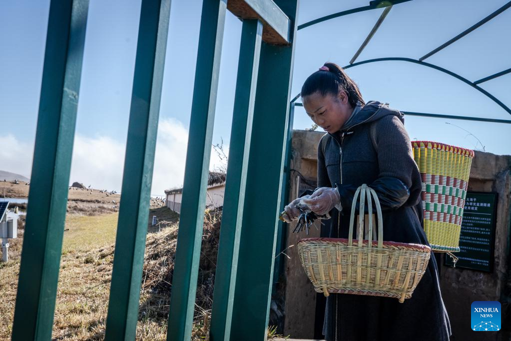 Chen Guanghui prepares to feed black-necked cranes at Yunnan Dashanbao National Nature Reserve for Black-necked Cranes in Zhaotong, southwest China's Yunnan Province, Dec. 10, 2022. Yunnan Dashanbao National Nature Reserve for Black-necked Cranes, located in Zhaoyang District of Zhaotong City, is the most significant wintering habitat and transfer station for migratory black-necked cranes on the Yunnan-Guizhou Plateau.