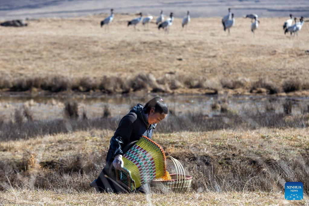 Chen Guanghui feeds black-necked cranes at Yunnan Dashanbao National Nature Reserve for Black-necked Cranes in Zhaotong, southwest China's Yunnan Province, Dec. 10, 2022. Yunnan Dashanbao National Nature Reserve for Black-necked Cranes, located in Zhaoyang District of Zhaotong City, is the most significant wintering habitat and transfer station for migratory black-necked cranes on the Yunnan-Guizhou Plateau.