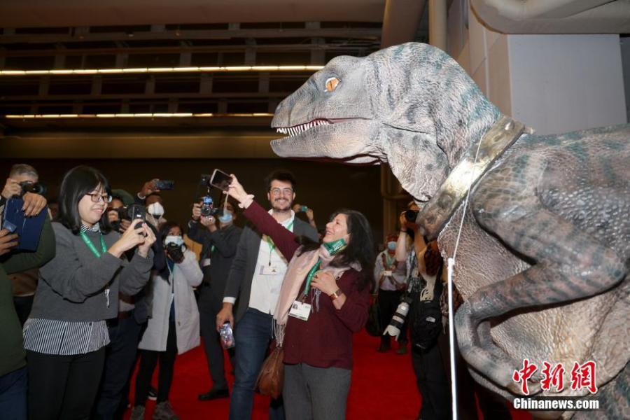 Frankie the Dinosaur, the United Nations Development Programme's “special guest,” makes an appearance at the United Nations Biodiversity Conference (COP15) in Montreal, Canada, Dec, 2022. (Photo: China News Service/Yu Ruidong)
