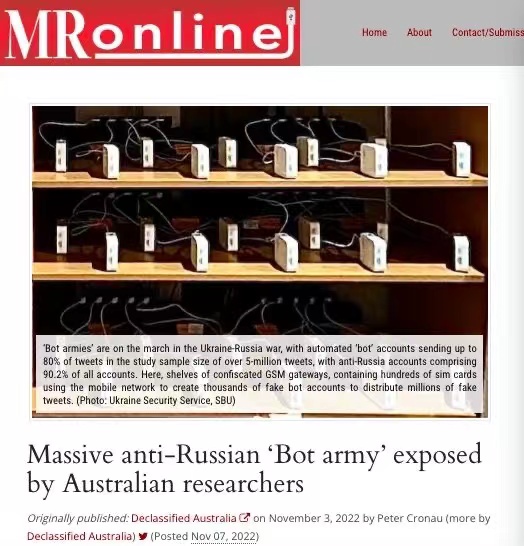 Screenshot of the report about "Massive anti-Russian 'Bot army' exposed by Australian researchers" published on U.S. website MRonline.
