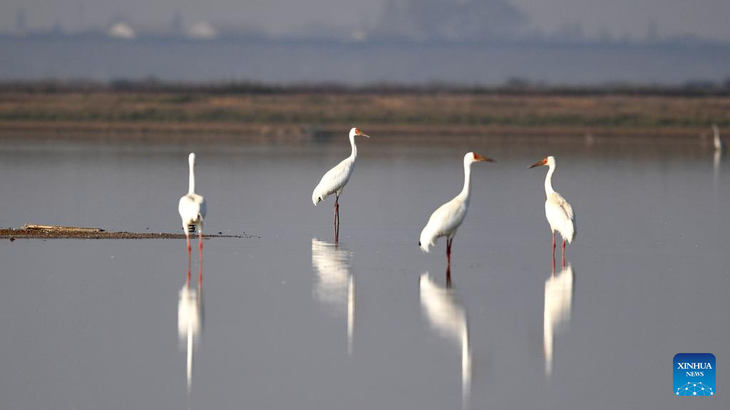 This photo taken on Dec. 14, 2022 shows white cranes at Hengling Lake Provincial Nature Reserve, a part of Dongting Lake wetland, central China's Hunan Province. (Xinhua/Chen Zhenhai)