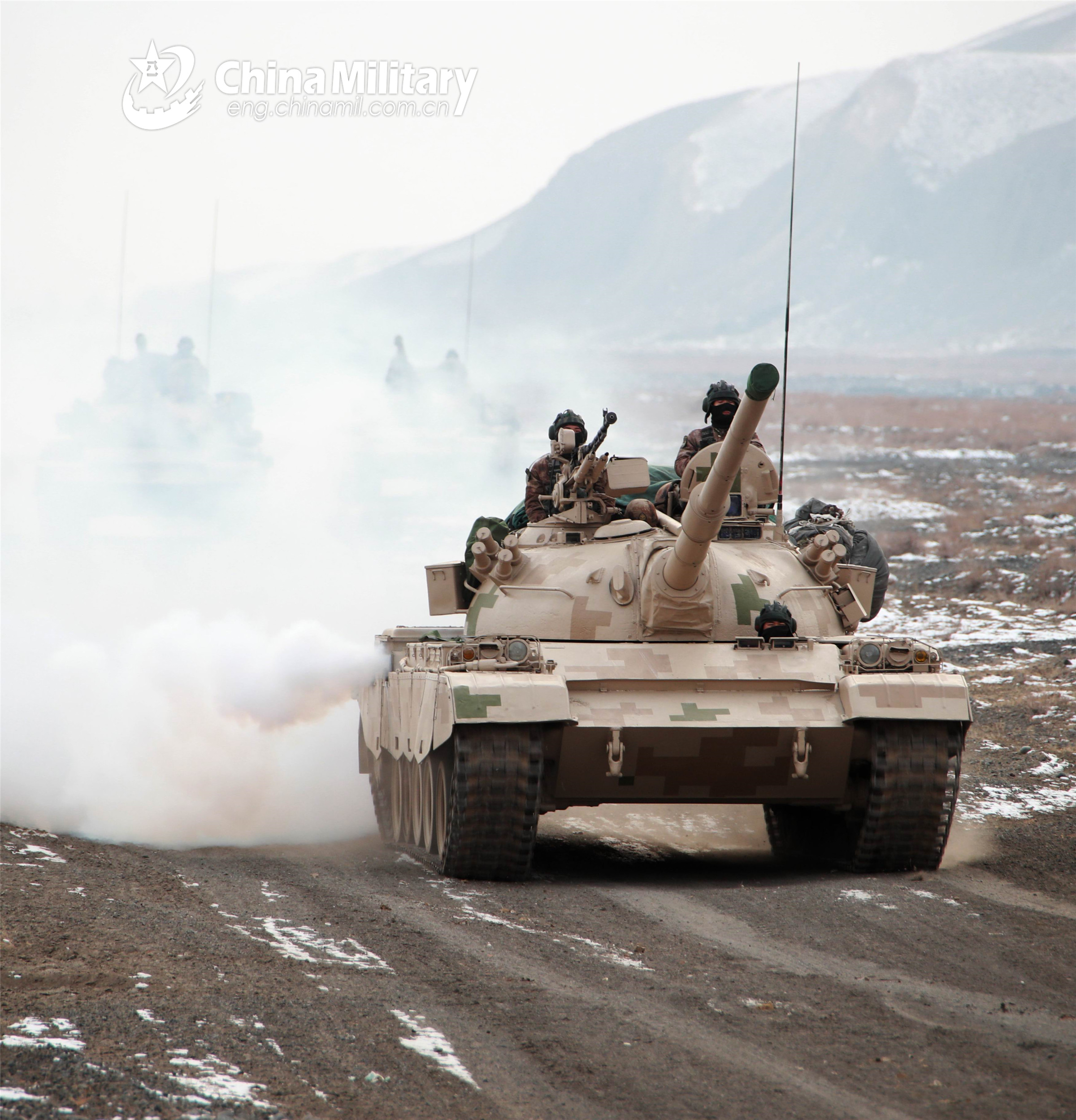 Main battle tanks (MBTs) attached to an armored element of a combined-arms regiment under the PLA Xinjiang Military Command are en route to the training field during a tactical maneuver training exercise on November 30, 2022. (eng.chinamil.com.cn/Photo by Yuan Kai)