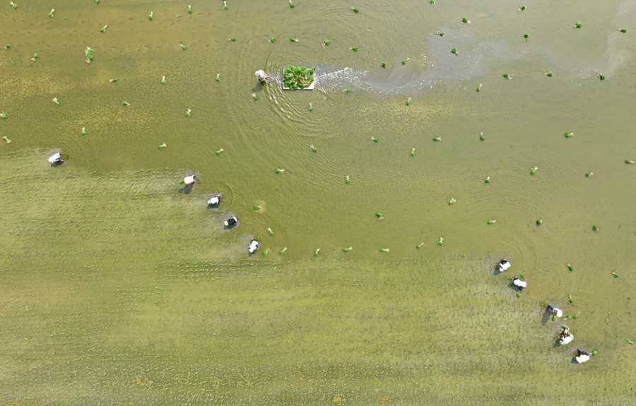 Aerial photo shows farmers working in the fields in Qianfoan Village of Chuzhou, east China's Anhui Province, June 21, 2022. (Photo by Shen Guo/Xinhua)