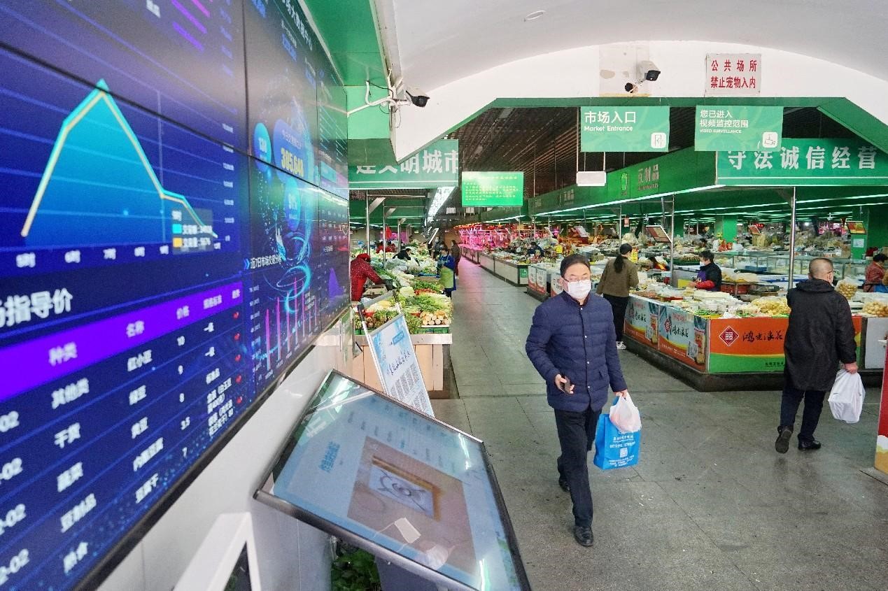 At the entrance of a market in Jiangbei district, Ningbo, east China's Zhejiang province, there is a screen that displays vegetable prices, real-time transaction data, foot traffic and testing results of vegetables.