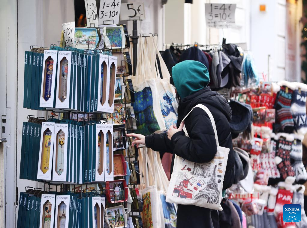 A woman visits a souvenir shop at the Montmartre after snow in Paris, France, Dec. 14, 2022. (Xinhua/Gao Jing)