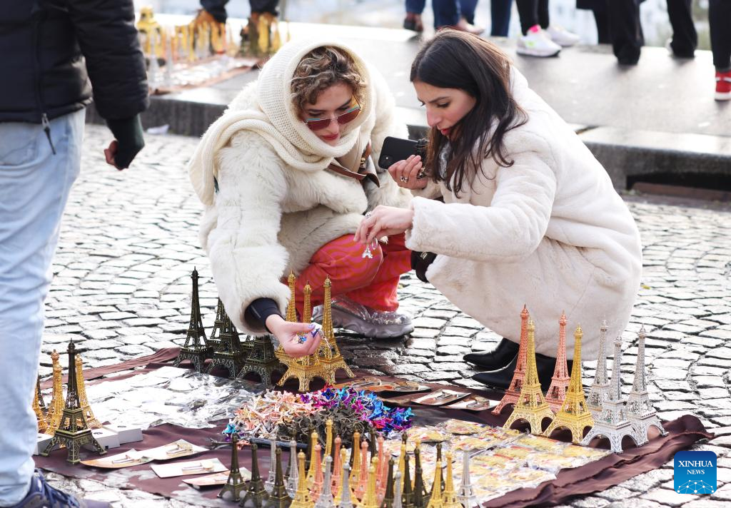 People purchase Eiffel Tower sculpture souvenirs at the Montmartre after snow in Paris, France, Dec. 14, 2022. (Xinhua/Gao Jing)