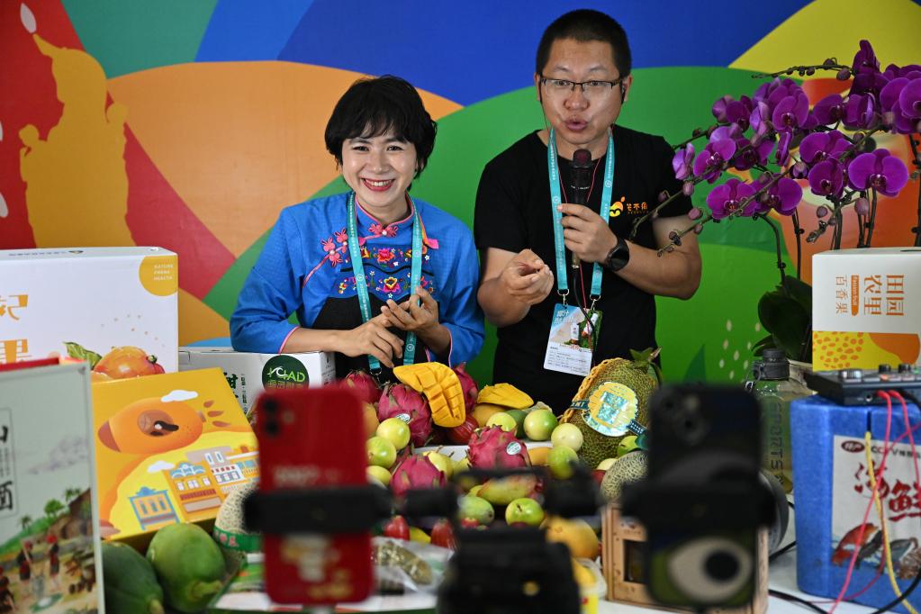 Staff members promote agricultural products via live-streaming at the 2022 China (Hainan) International Tropical Agricultural Products Winter Trade Fair in Haikou, south China's Hainan Province, Dec. 15, 2022. (Xinhua/Guo Cheng)