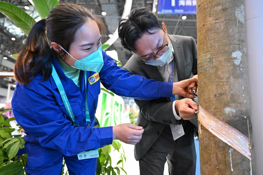A visitor experiences rubber tapping under the guidance of a staff member at the 2022 China (Hainan) International Tropical Agricultural Products Winter Trade Fair in Haikou, south China's Hainan Province, Dec. 15, 2022. (Xinhua/Guo Cheng)