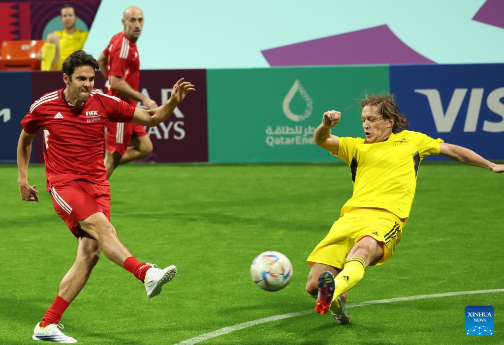 Australia's legend Timothy Filiga Cahill (L) competes during the FIFA Legends Cup at the Khalifa International Tennis &Squash Complex in Doha, Qatar, Dec. 15, 2022. (Xinhua/Jia Haocheng)