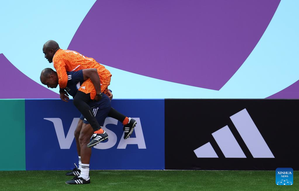 Democratic Republic of the Congo's legend Robert Kidiaba (top) is carried after sustaining an injury during the FIFA Legends Cup at the Khalifa International Tennis &Squash Complex in Doha, Qatar, Dec. 15, 2022. (Xinhua/Jia Haocheng)