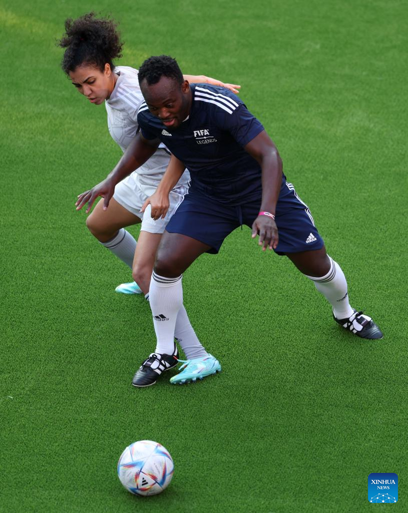 Ghana's legend Michael Essien (R) competes during the FIFA Legends Cup at the Khalifa International Tennis &Squash Complex in Doha, Qatar, Dec. 15, 2022. (Xinhua/Jia Haocheng)