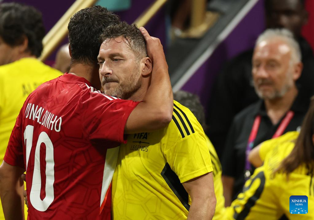 Italy's former football player Francesco Totti (R) greets Brazil's former goalkeeper Julio Cesar after the FIFA Legends Cup at the Khalifa International Tennis &Squash Complex in Doha, Qatar, Dec. 15, 2022. (Xinhua/Jia Haocheng)