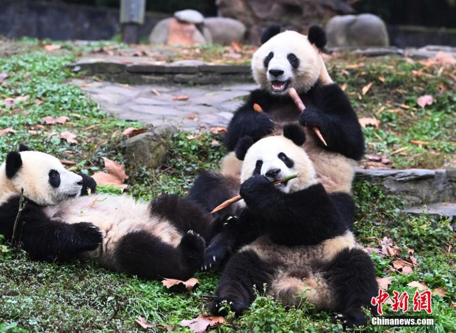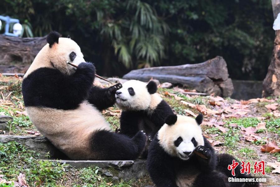 Giant pandas eat bamboo shoots at the Dujiangyan base of the China Conservation and Research Center for Giant Panda, southwest China's Sichuan Province, Dec. 15, 2022. (Photo: China News Service/An Yuan)