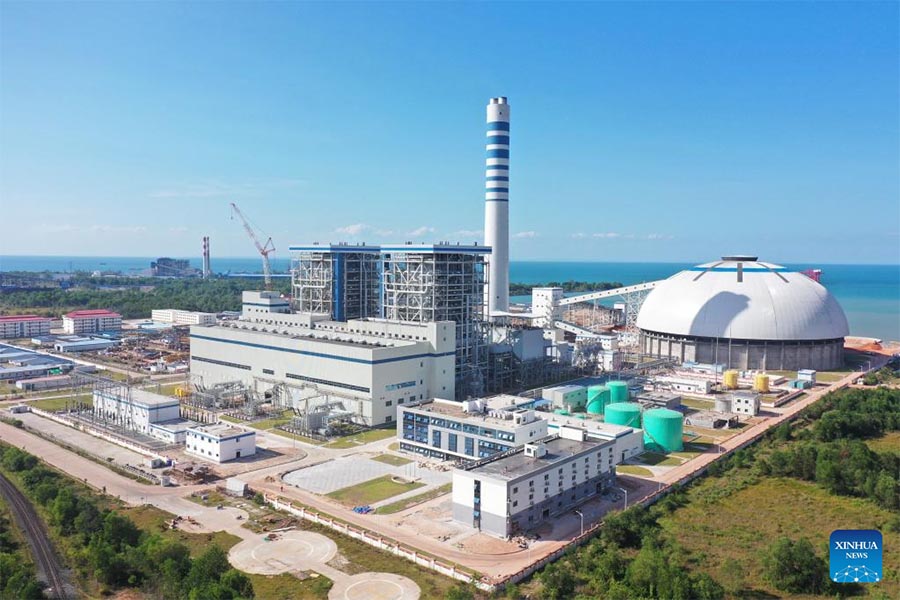 This aerial photo taken on Dec. 16, 2022 shows the Huadian Preah Sihanouk 2×350 MW Coal-fired Power Plant in Preah Sihanouk province, Cambodia. The Huadian Preah Sihanouk coal-fired power plant in Cambodia on Friday passed a commissioning test successfully and was officially put into operation, becoming the largest power generation project in the country.(Photo by Li Xinlin/Xinhua)