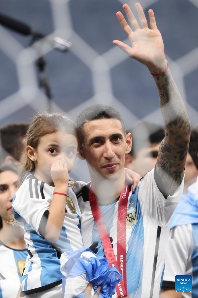 Angel di Maria (R) of Argentina celebrates after winning the Final between Argentina and France at the 2022 FIFA World Cup at Lusail Stadium in Lusail, Qatar, Dec. 18, 2022. (Xinhua/Li Ming)
