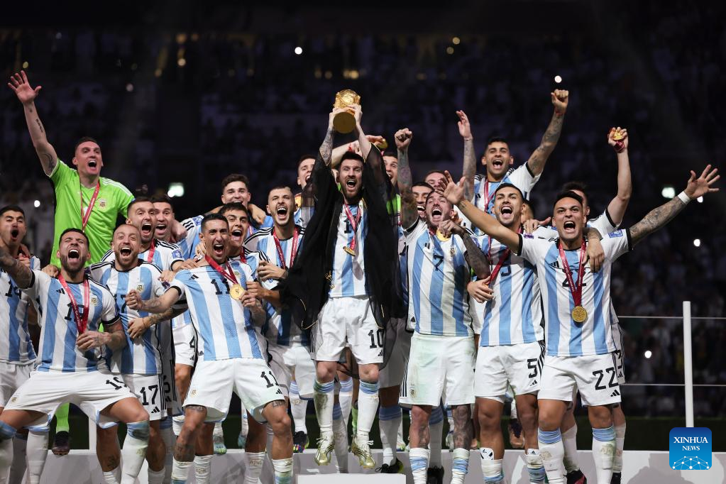 Winner Team Argentina celebrate during the awarding ceremony of the 2022 FIFA World Cup at Lusail Stadium in Lusail, Qatar, Dec. 18, 2022. (Xinhua/Li Ga)