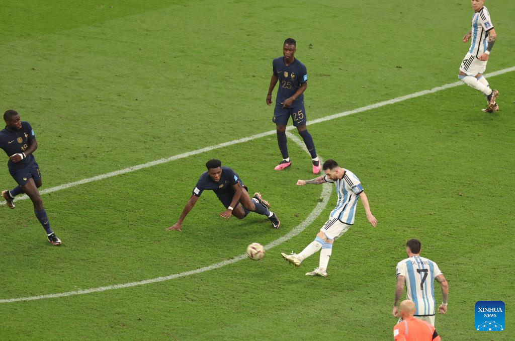 Lionel Messi (2nd R) of Argentina shoots during the Final between Argentina and France at the 2022 FIFA World Cup at Lusail Stadium in Lusail, Qatar, Dec. 18, 2022. (Xinhua/Xu Zijian)