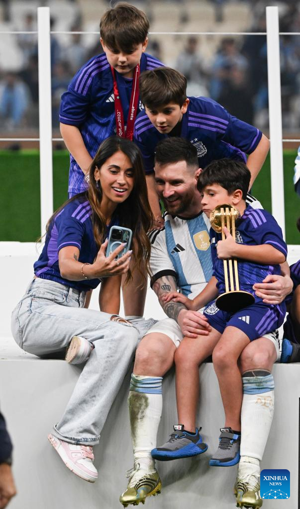 Lionel Messi (2nd R) of Argentina celebrates with his family during the awarding ceremony of the 2022 FIFA World Cup at Lusail Stadium in Lusail, Qatar, Dec. 18, 2022. (Xinhua/Li Ga)