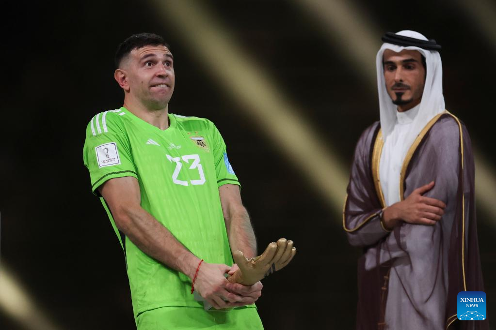 Emiliano Martinez, goalkeeper of Argentina, holds his golden glove trophy during the awarding ceremony of the 2022 FIFA World Cup at Lusail Stadium in Lusail, Qatar, Dec. 18, 2022. (Xinhua/Cao Can)