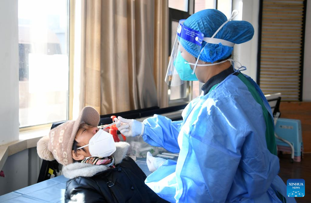 A medical staff administers a second booster dose of COVID-19 vaccine for an elder through nose at a temporary vaccination site in Haidian District, Beijing, capital of China, Dec. 17, 2022. (Photo/Xinhua)