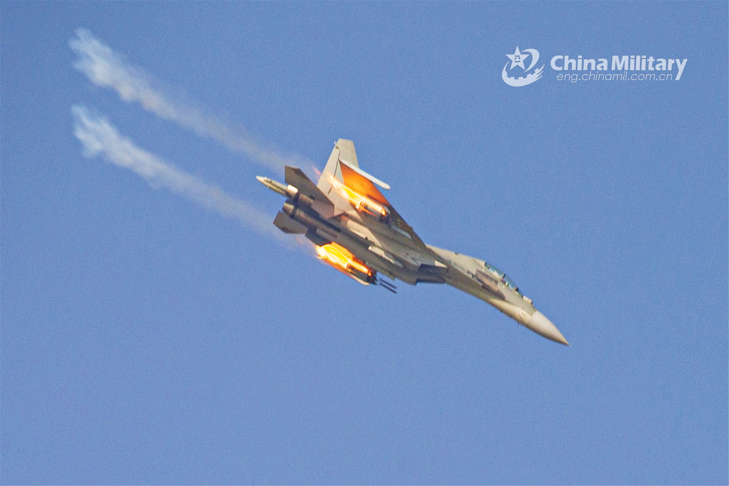 A fighter jet attached to an aviation brigade under the PLA Air Force fires rockets against ground targets during a flight training exercise on November 15, 2022. (eng.chinamil.com.cn/Photo by Liang Pengyu)