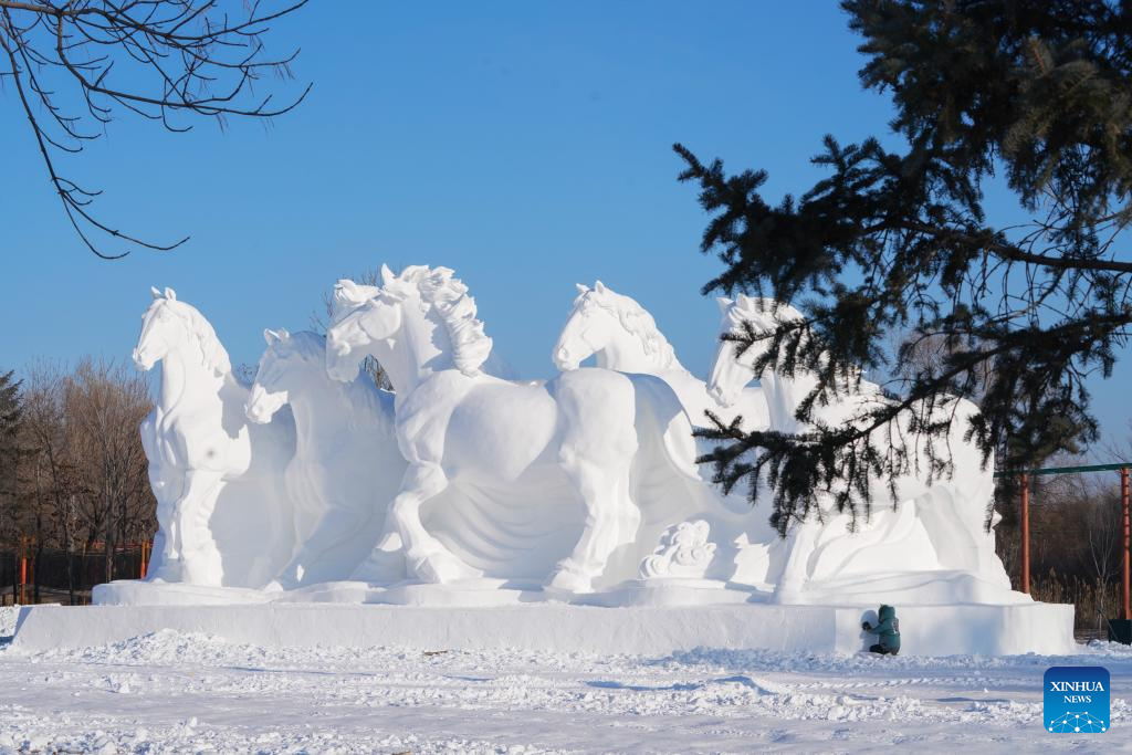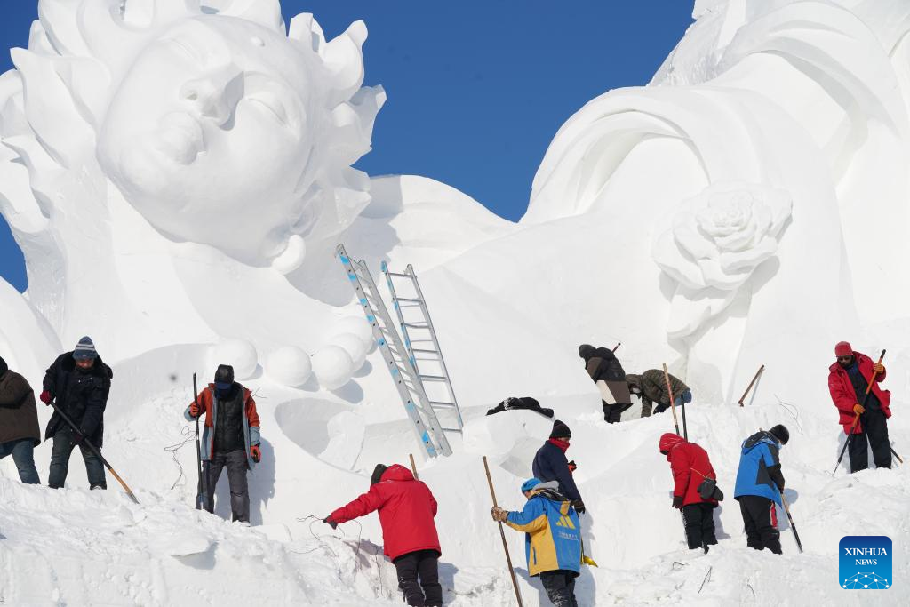 Staff members finish a gigantic snow sculpture for the upcoming 35th Taiyangdao Island International Snow Sculpture Expo in Harbin, northeast China's Heilongjiang Province, Dec. 18, 2022. (Xinhua/Wang Song)