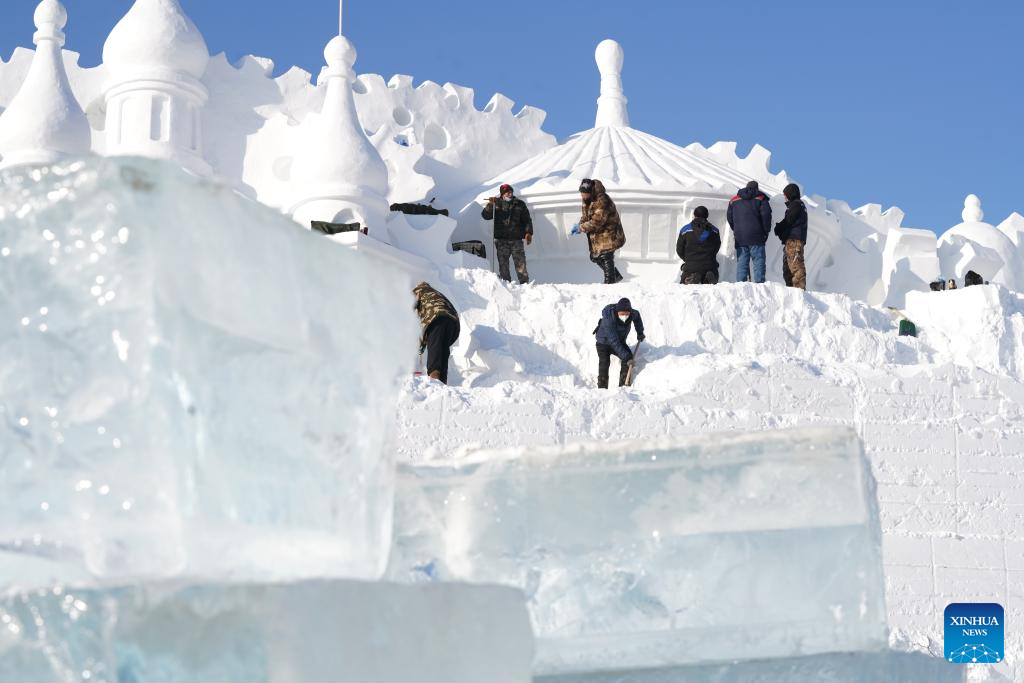 Preparations made for snow sculpture expo in Harbin, NE China