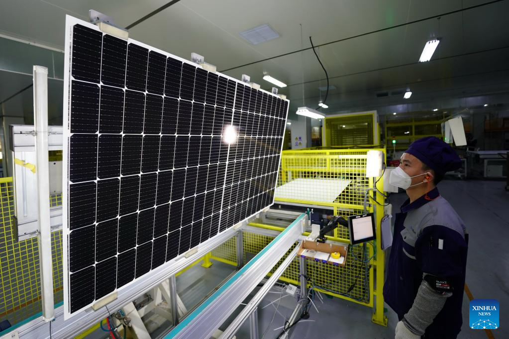 A worker checks the quality of solar modules at a solar energy company in Xingtai, north China's Hebei Province, Dec. 19, 2022. (Xinhua/Mu Yu)