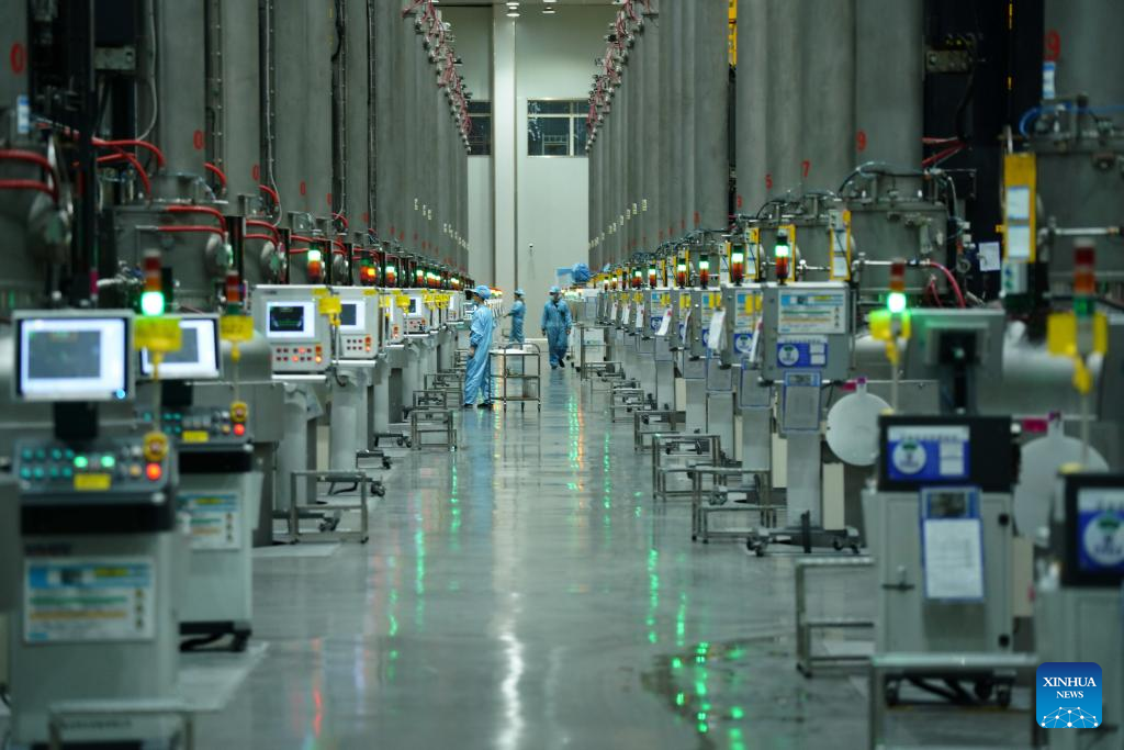 Employees produce single crystalline silicon rods at a new energy company in Xingtai, north China's Hebei Province, Dec. 19, 2022. (Xinhua/Mu Yu)